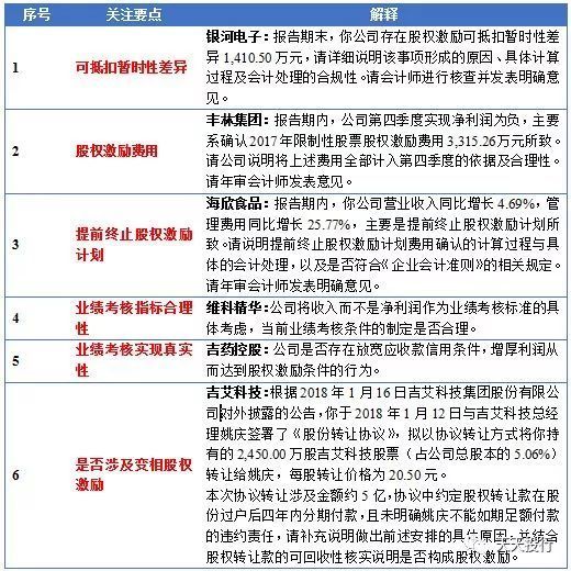 由于目前上市公司股权激励已经无需履行“证监会备案,抄送交易所、证监局”的程序,因此,监管层对上市公司股权激励监管主要是交易所通过年报问询函对股权激励进行监管,主要关注点包括可抵扣暂时性差异、股权激励费用、提前终止股权激励计划、业绩考核指标合理性及实现真实性、是否涉及变相股权激励等。